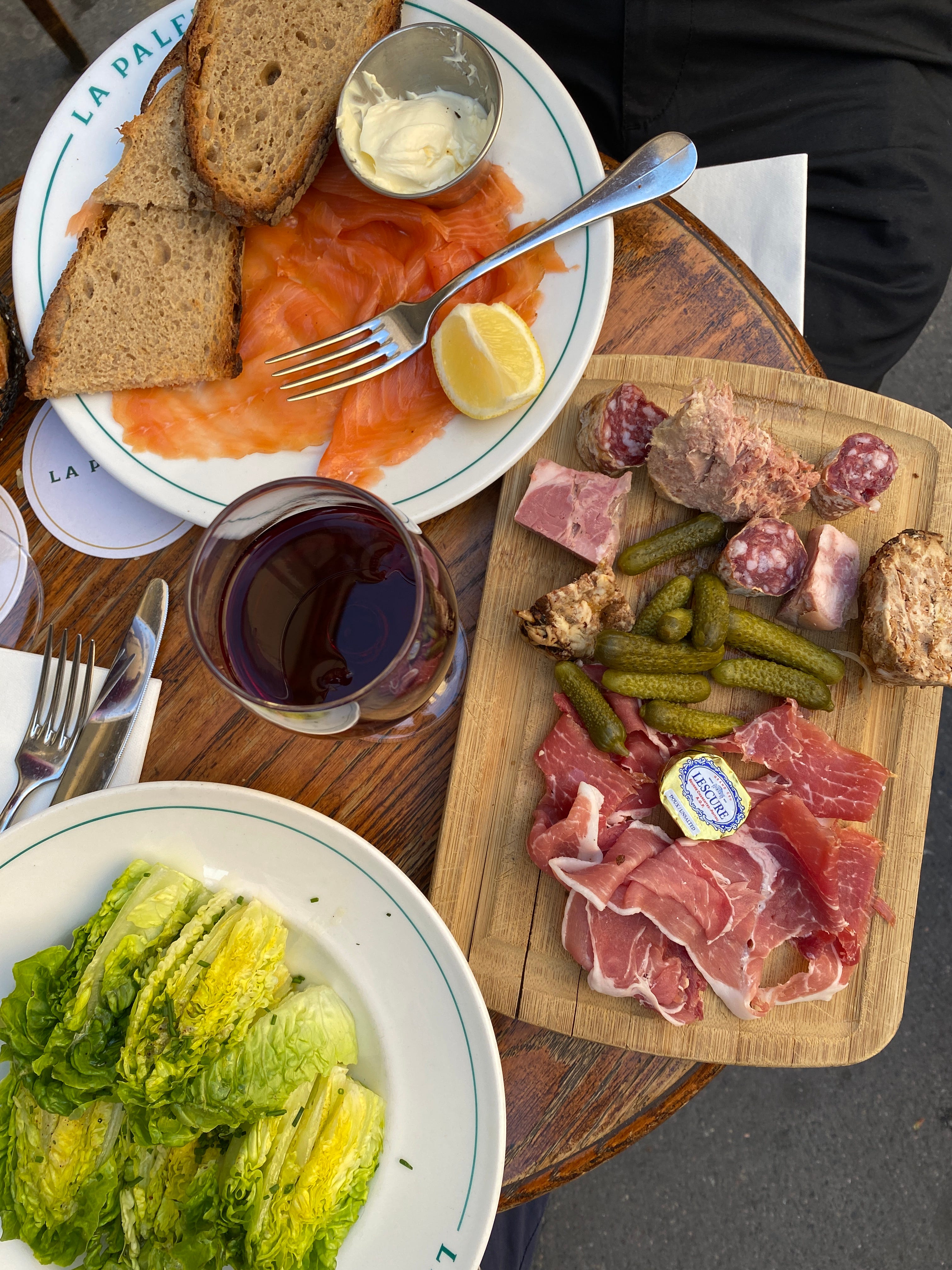 The evening menu is more for grazing, for lack of a better word, with small plates meant to share. We stopped in for a charcuterie plate, gravlax, a salad of crisp sucrine, and glasses of red wine after an event in the area, ordering what you see above. What you don’t see is the Croque Monsieur, which is cut into bites (for the apéro crowd), which the neighboring table had ordered and I was coveting a bite but was too timid to ask. Next time, I’ll order one for us. [La Palette website and Instagram.]