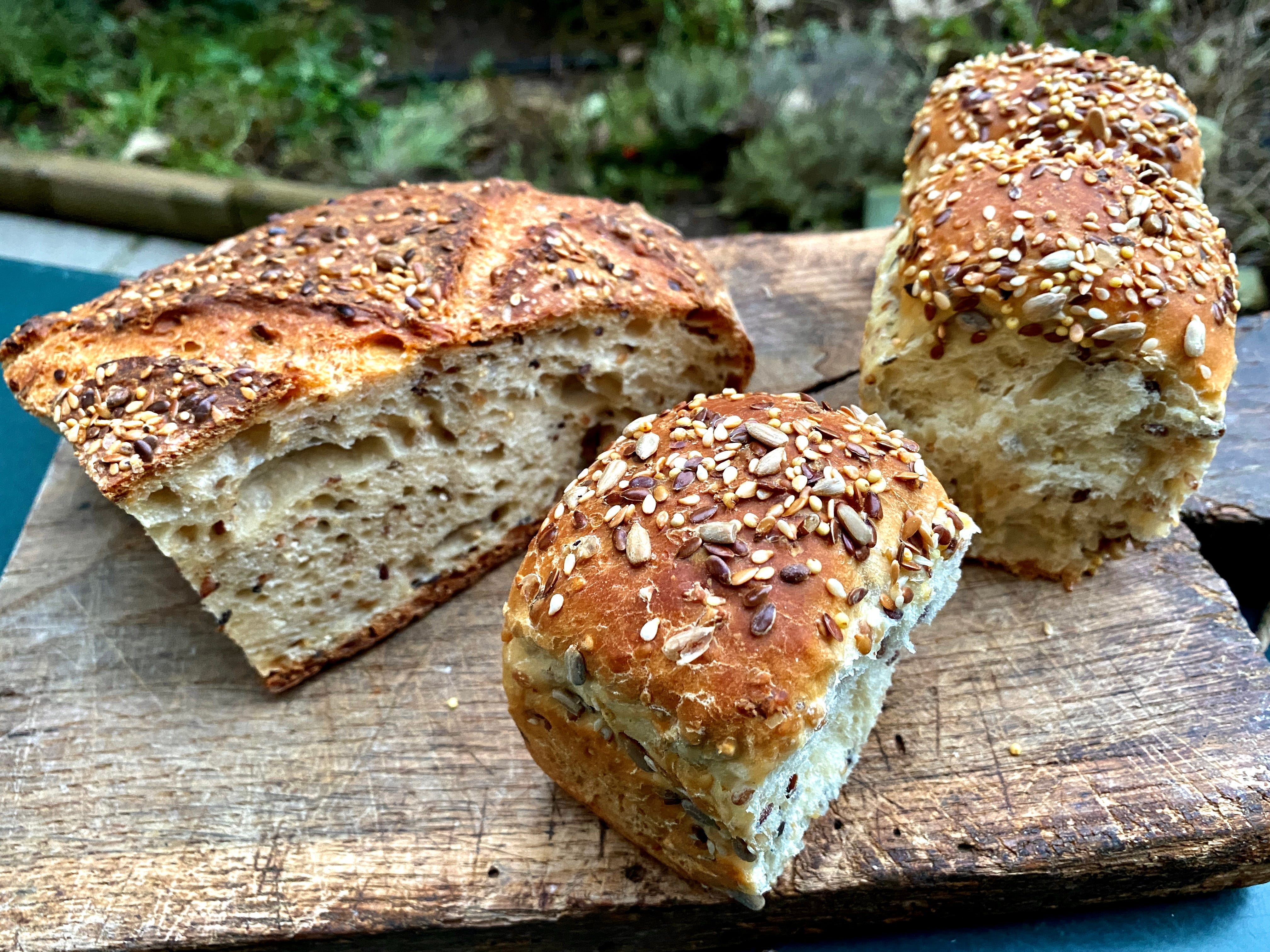 I had a rare morning free and was biking up to Comer for lunch, after getting a winter bonnet (cap) at GoSport, since it’s been quite cold here and I wanted one that would fit under my bike helmet. After two staff members insisted they didn’t carry them, I found a stack of them in the running department. Pleased with myself, and my warm head, I found myself passing Mamiche bakery, which had a line outside. I skipped the popular babka and went for the bread, picking up a loaf of grainy pain de mie, which was outstanding, and another called XL grains (above, left).