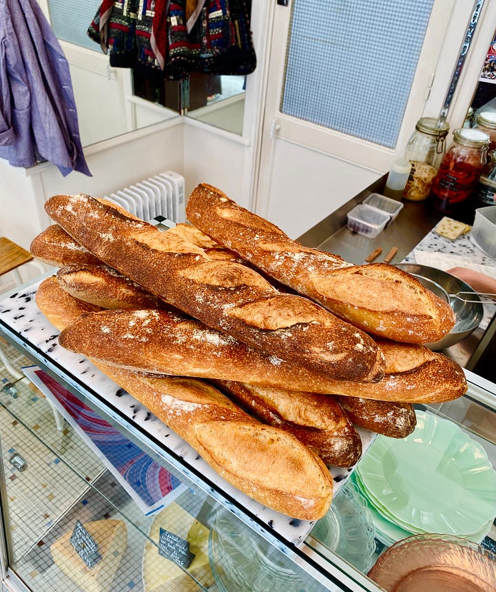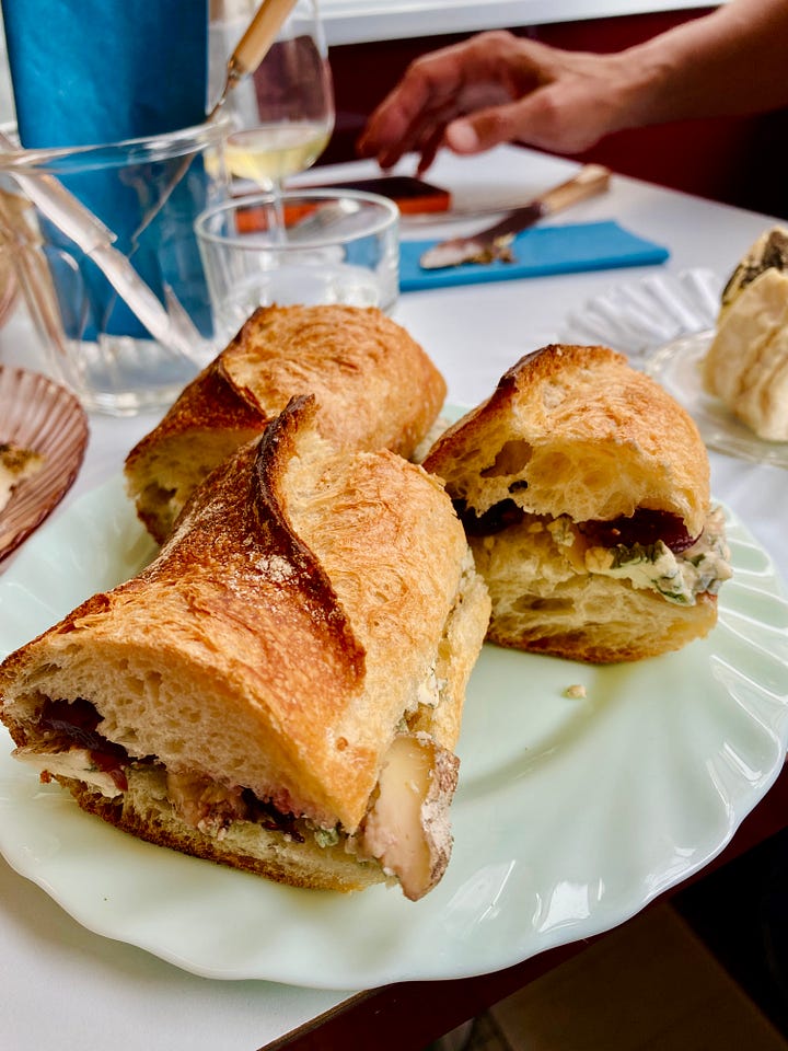 A stack of bien cuites (well-cooked) baguettes sits on the counter, ready to be split open and made into sandwiches. We shared a sandwich inspired by the blue cheese–Amarena cherry bao at Yam T’Cha, which Camille confessed was her favorite of their baos. (It’s not my favorite combo in a bao but works better for me in a sandwich.)
