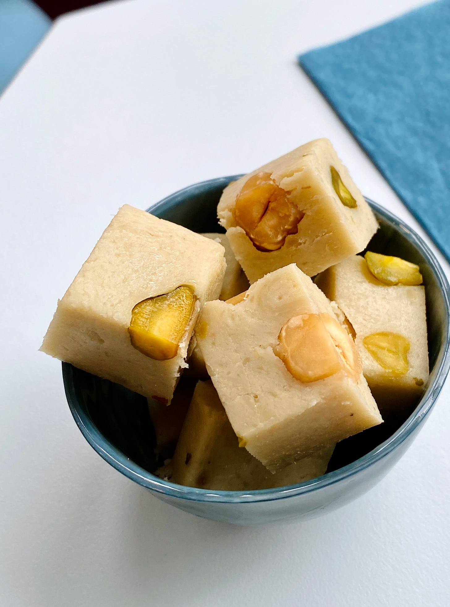 Made in-house with leftover bits and ends of cheese formed into nougat-like cubes, and studded with hazelnuts and pistachios, it resembles its sweeter counterpart.