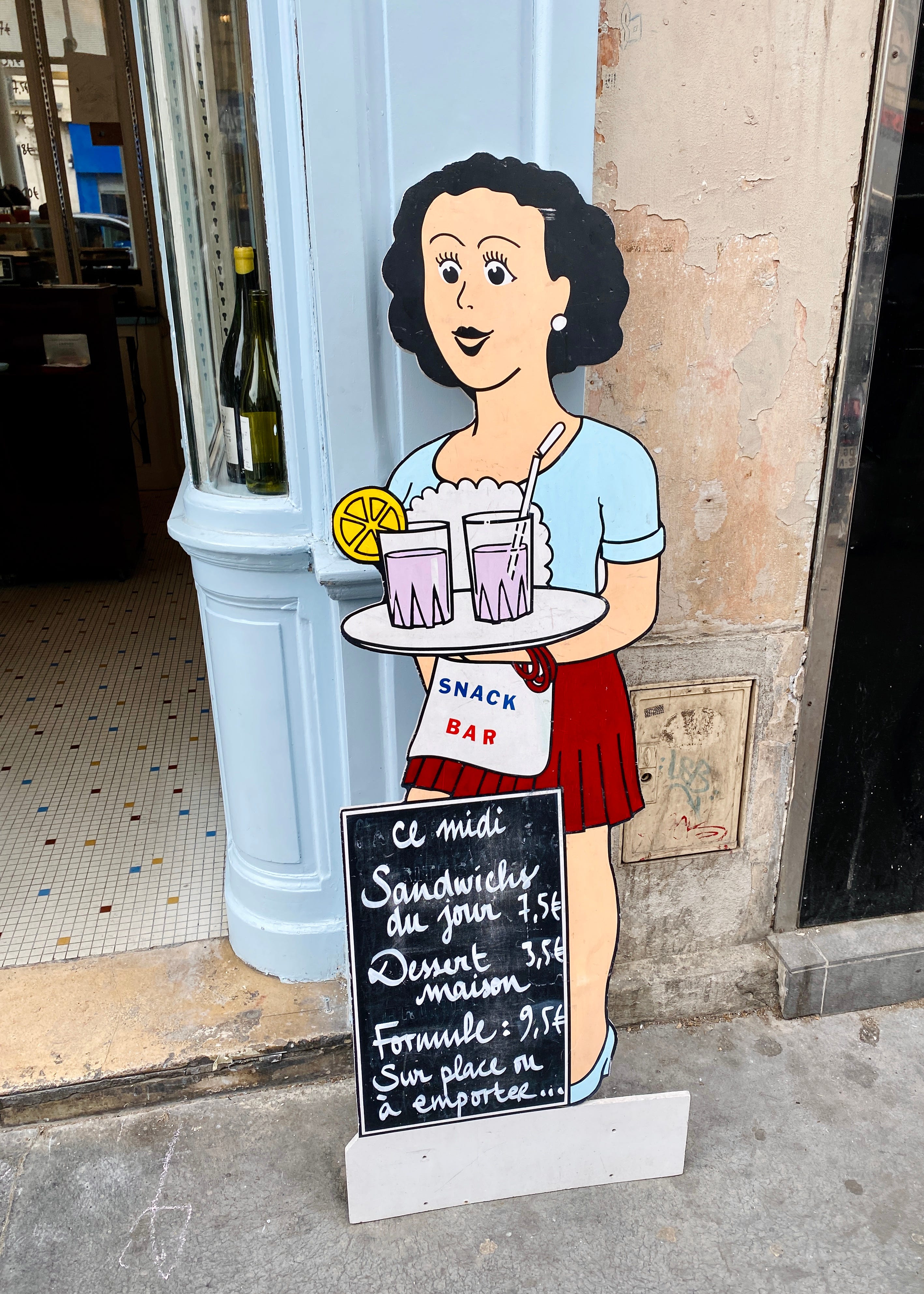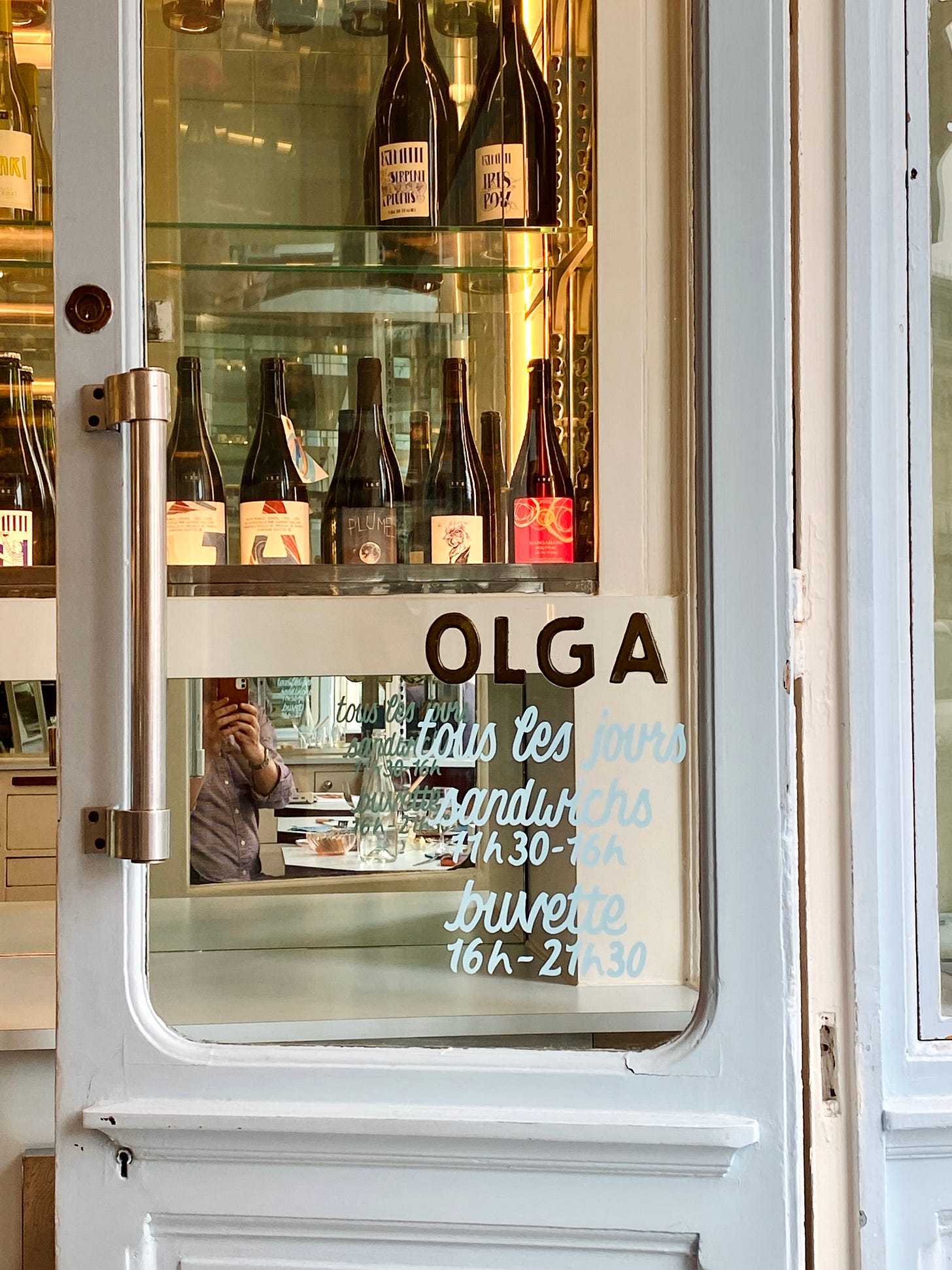 Olga, her new café/wine bar/buvette (drinking spot), is another gem. Just after I arrived at Olga on my first visit, I asked Camille where the old candy shop was that used to be on the same street. She said, “David, this is the old candy shop!”