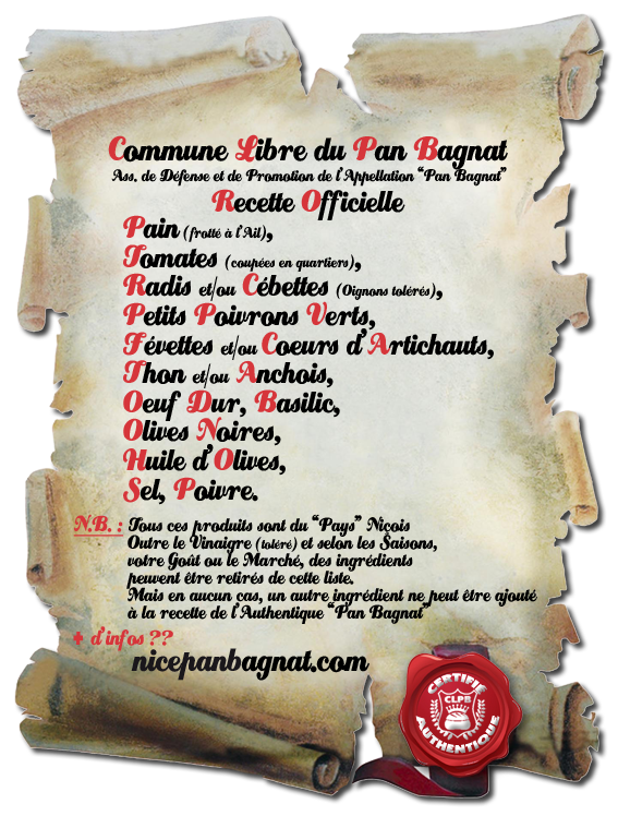 Pan Bagnat (aka Pan Bagna) is the sandwich version of the Salade Niçoise and because it’s France, of course there’s an organization to defend it, called the Commune Libre du Pan Bagnat with its own website, and it lists the ingredients on a virtual scroll (below), noting just a few “tolerated” exceptions, such as you can use onions if cébettes, or green onions, can’t be found.