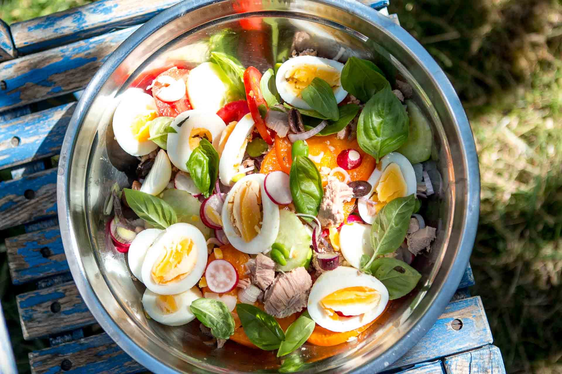You don’t need to precisely measure cucumbers or weigh olives. Below are guidelines for making a Niçoise Salad mixture, which gets stuffed in the olive oil–soaked bread. Because bagnat (or bagna) means “soaked,” don’t be stingy with the olive oil. As Mireille Johnston says, “This is one sandwich that tastes best soggy.”