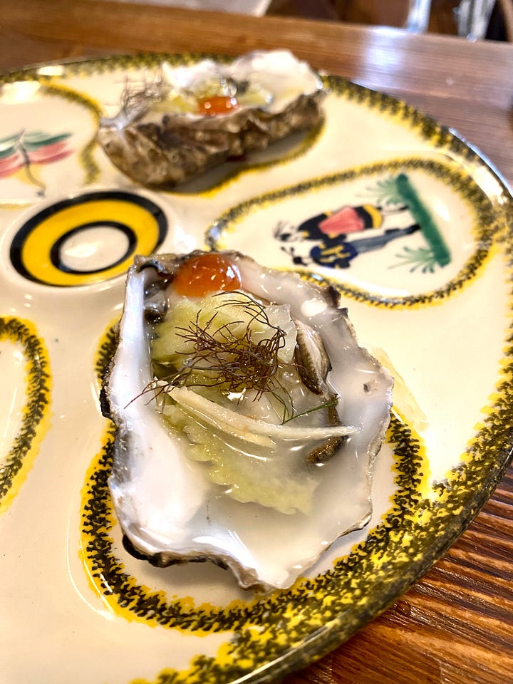 When my friend Mat came to town bearing bottles of his distillations, made in the heart of Burgundy from local ingredients. It was nice to catch up with him and his wife at Capitaine, where chef Baptiste Day is keeping the food focused on very fresh ingredients. I had a plate of lightly pickled vegetables and sardines, and the chef sent out a few oysters with grapefruit and fennel to try, which were both very good. And yes, I loved the oyster plate, too.