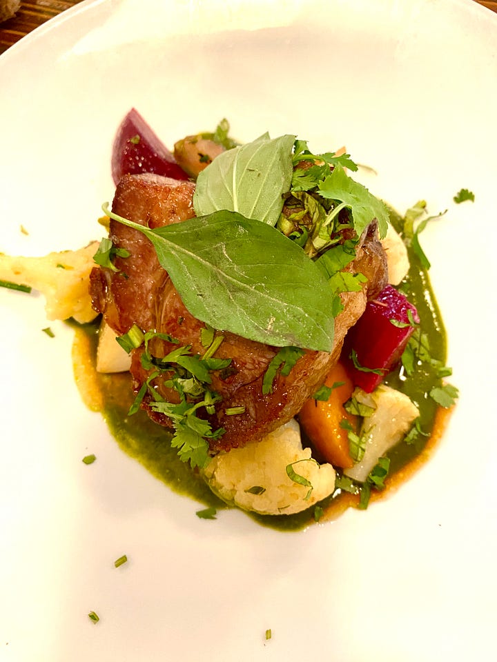 My friends both went with the sweetbreads, but the côte de porc (pork chop) was calling me, and it was probably the best pork I’ve had in France. It seems like someone’s bred the flavor out of pork, so it was nice to dive into a really great, flavorful pork chop with carefully cooked vegetables with a sauce that was so good, I flagged down the busy chef to tell him how terrific it was.