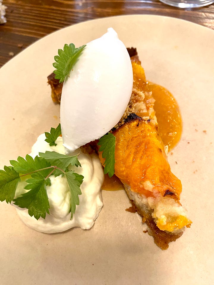 Dessert was a brown butter–apricot tart with house-made coconut ice cream, which wasn’t picture perfect (which is fine as I’m wary of fruit desserts that look too perfect — fruit should be ripe, juicy, and a little messy), and since it’s the season for apricots, I was happy to indulge along with a few sips of Mat’s new apricot eau-de-vie. (Capitaine)