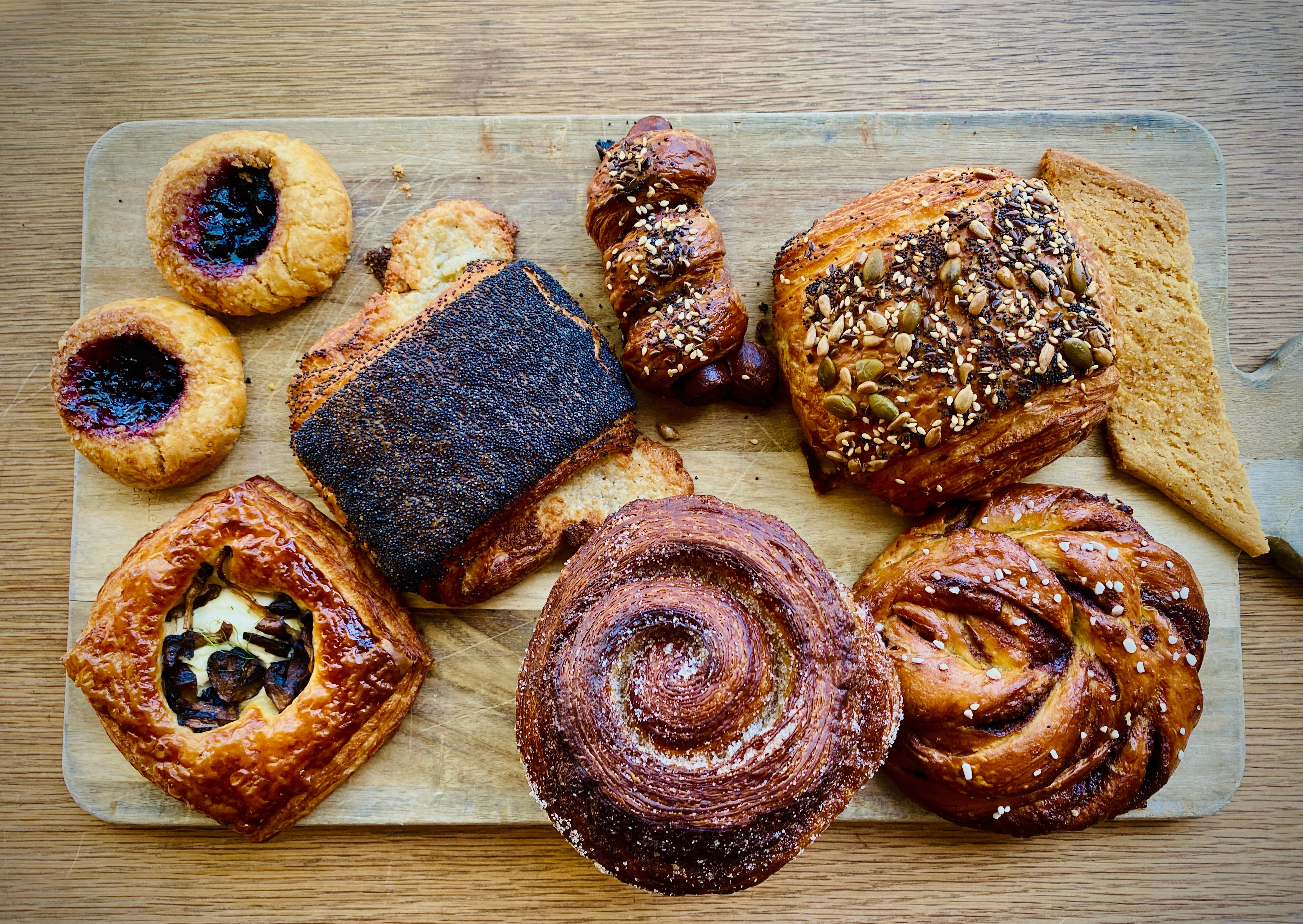 I had spectacular luck when I was in San Francisco and a friend suggested we meet up one morning at Kantine, a Scandinavian bakery and café. Arriving a little early, I was knocked out by the beautiful selection of pastries and breakfast offerings, which included open-faced smoked fish sandwiches on housemade sprouted rye bread, savory grain porridge, and a Scandinavian take on the breakfast sandwich, the Grovbirkes, a seed-crusted spiral of buttery puff pastry filled with warm scrambled eggs and crisp bacon. I wanted it all!