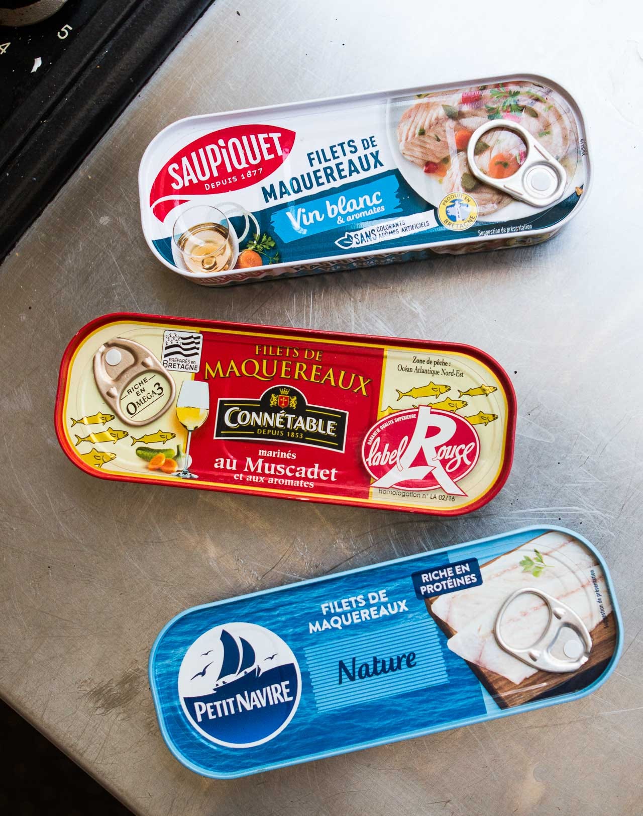 Tinned mackerel comes in different sizes in France (some are 110 grams, others are 176 grams) than in the U.S. and elsewhere, where they tend to be around 4 ounces, or around 115-125 grams.