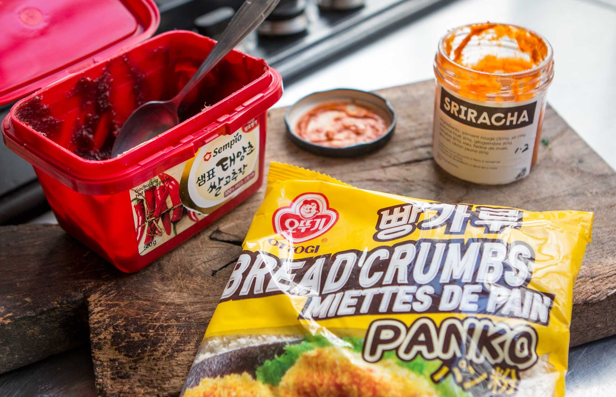 Gochujang, which was called for in the original recipe, is Korean chile paste. It can vary but is usually moderately spicy and a little sweet. You can substitute another chile paste or sauce but perhaps use less, depending on your preference for spiciness. You can also use a dusting of cayenne pepper, or leave it out.