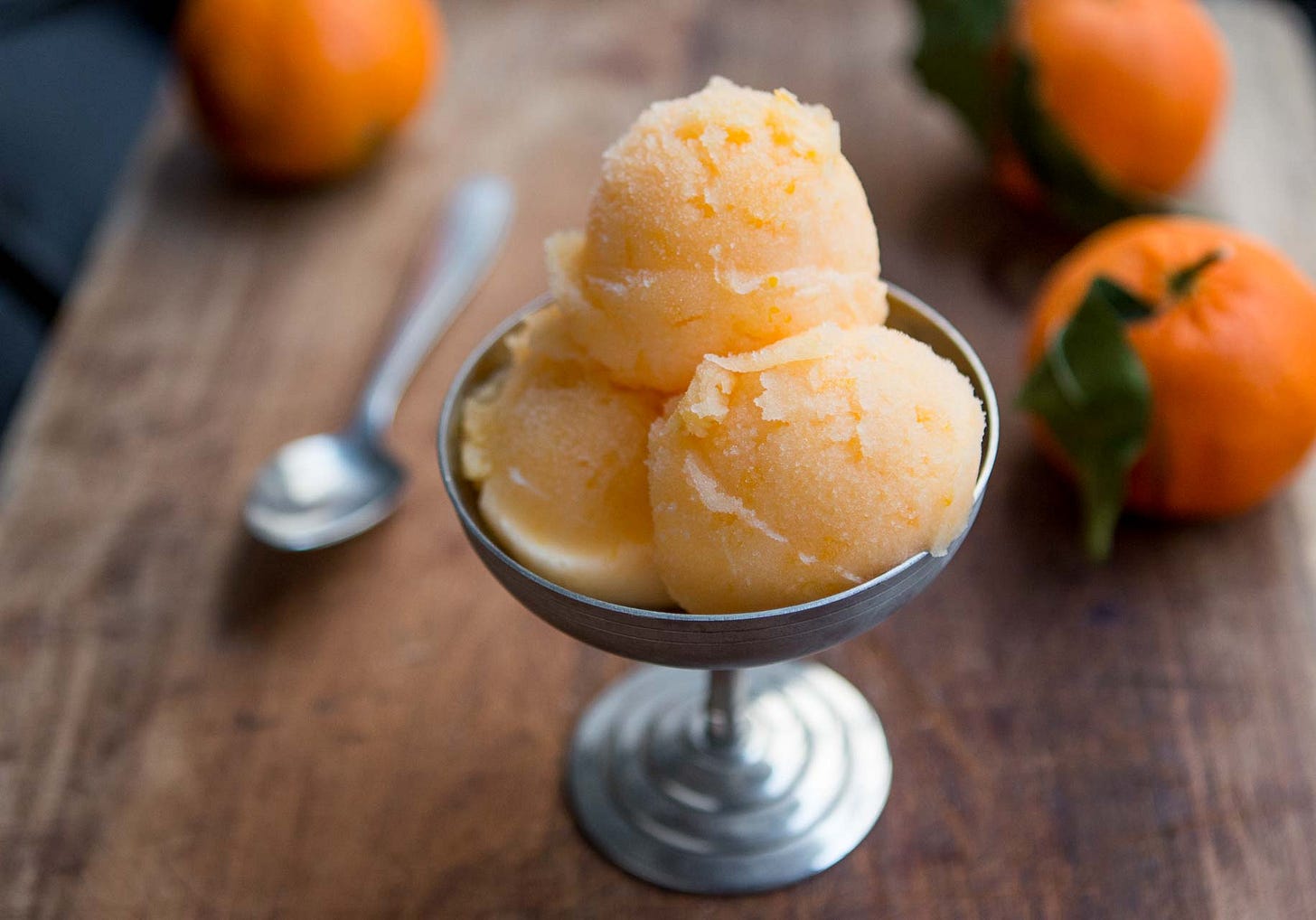 Add alcohol. Alcohol, like sugar, inhibits freezing due to its lower freezing temperature. There’s more info on that, and how much you can use, in my post about keeping homemade ice cream soft. But citrus is at least 90% water, so in something like this tangerine sorbet, you’re essentially freezing a lot of water, so I add some spirits to it to keep things smoother. And for flavor, of course. Who doesn’t want more flavor?