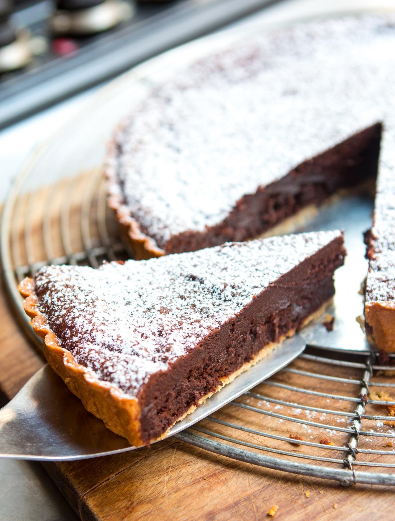 Voilà—it turned out great! High and lofty, rich and chocolatey, but yet light and almost soufflé-like. I set the tart pan on an overturned moka pot bottom (you can use a coffee can or something similar), then slid the tart onto a flat surface to slice it, using a warm knife. (I warmed the blade over the flame of my gas stove for a few seconds, wiping it clean between each slice.) I didn’t do a picture-perfect job with the slice as I was eager to taste it after I took a picture.