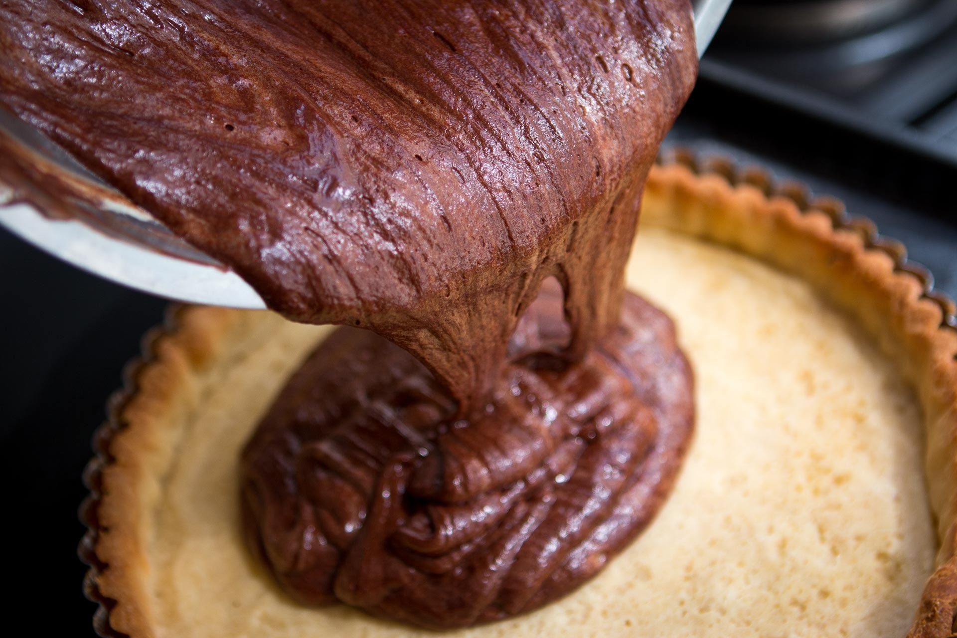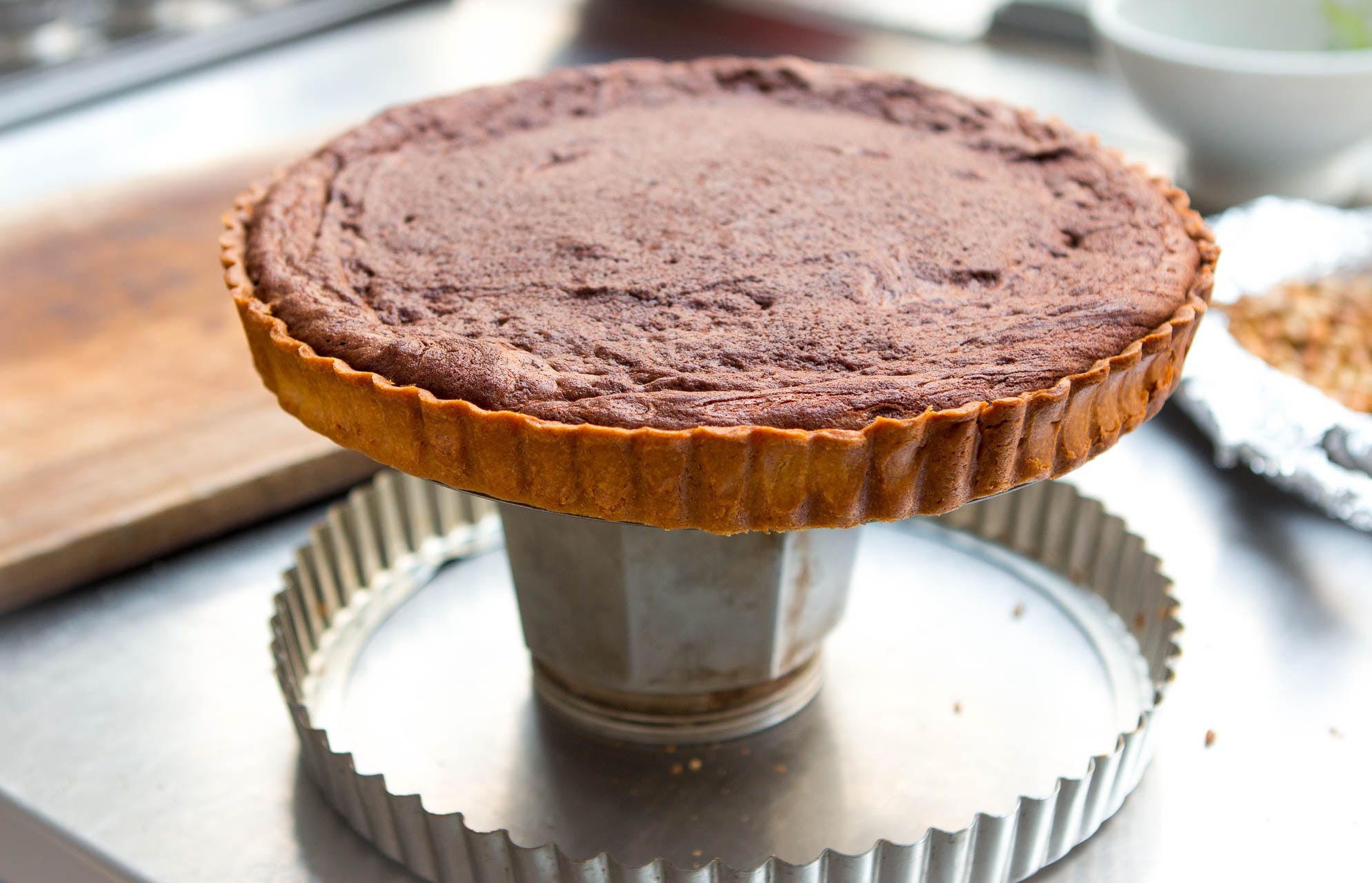 10. Very gently fold the beaten eggs into the tepid chocolate, just until no visible streaks of egg remain. Do not overfold (i.e., better to have a few streaks than deflate the mixture). Wipe the bottom of the bowl so it’s dry, then scrape the filling into the baked tart shell and bake until the tart feels almost set in the center but is still quite soft and tender, about 12 minutes. Err on the side of underbaking rather than overbaking. Better to rely on tactile and visual clues rather than fixed numbers.