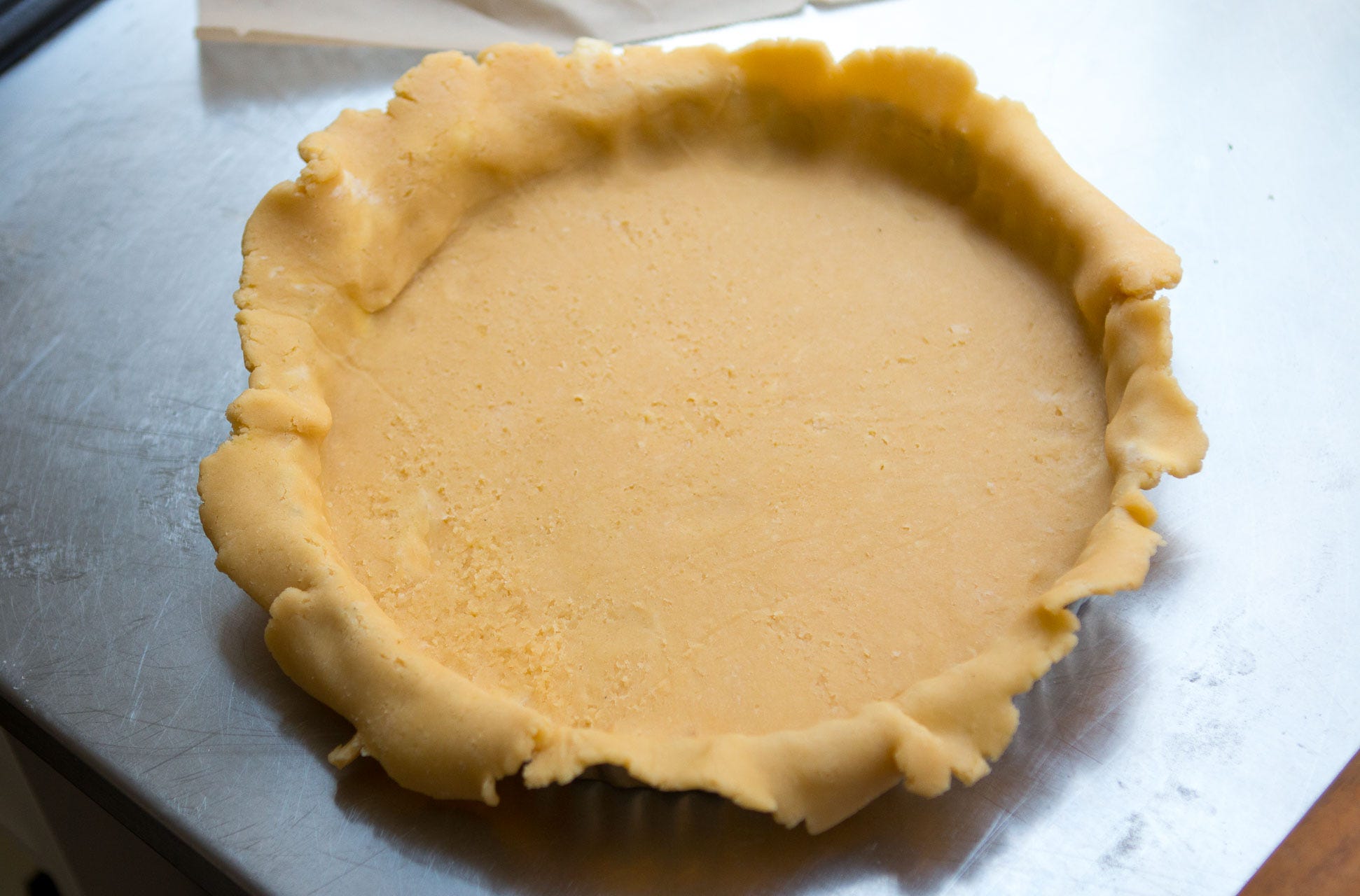 I made a lot of changes to the recipe and the instructions but kept the spirit of it intact. The only tricky part is rolling the dough. It may require a bit of moxie to roll it out to the right diameter, and peeling off the parchment paper can cause the dough to tear if you’re not careful. But it’s not a big deal if it does. Go slow and if it does happen, just pinch and patch it together once it’s in the tart pan. Once the tart is baked, no one will be the wiser.