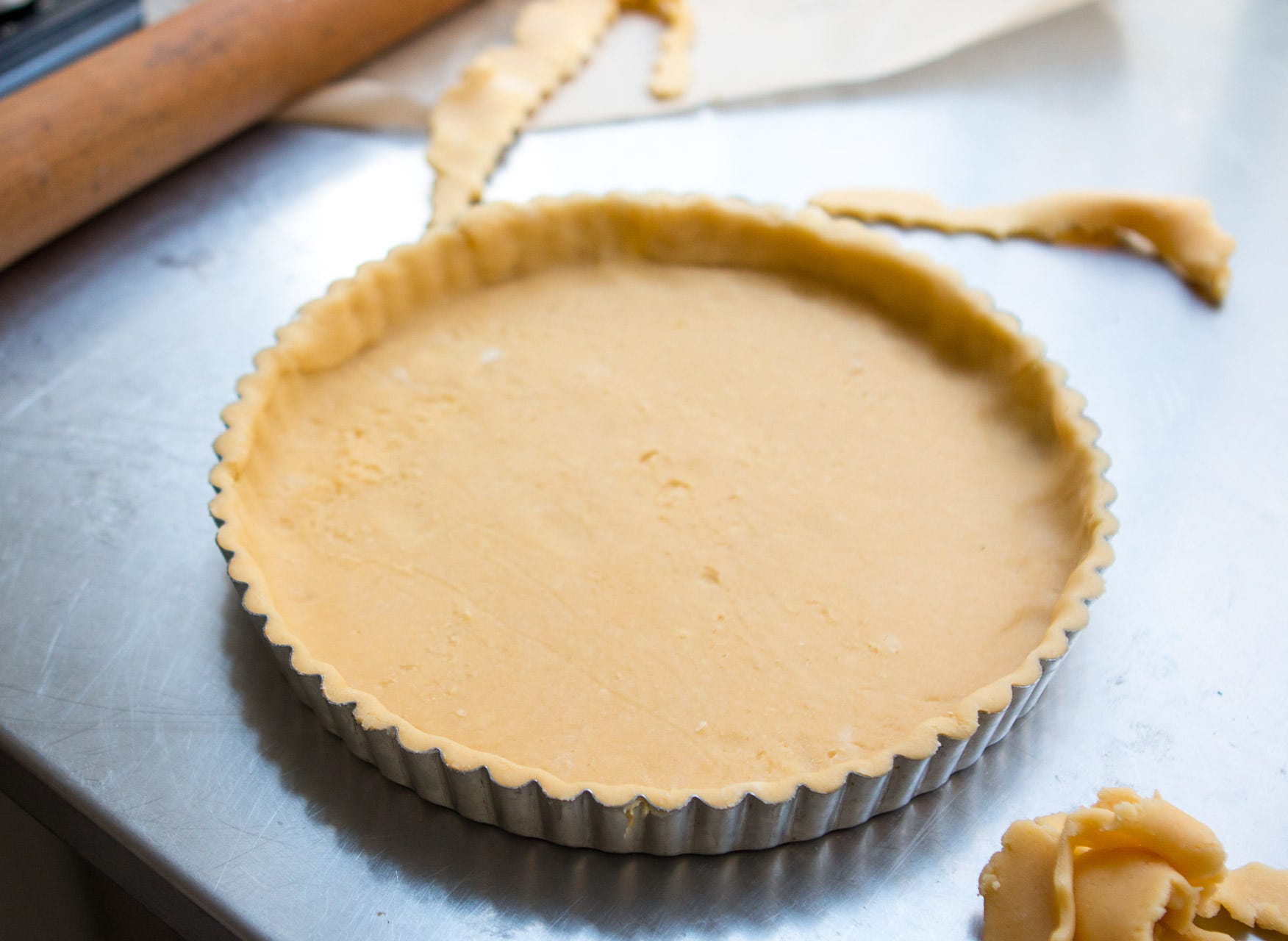 (Save all the dough scraps in case you need to use them later to patch anything. If not, they can be rolled out and cut into shapes to bake little sablés, or butter cookies, out of.)