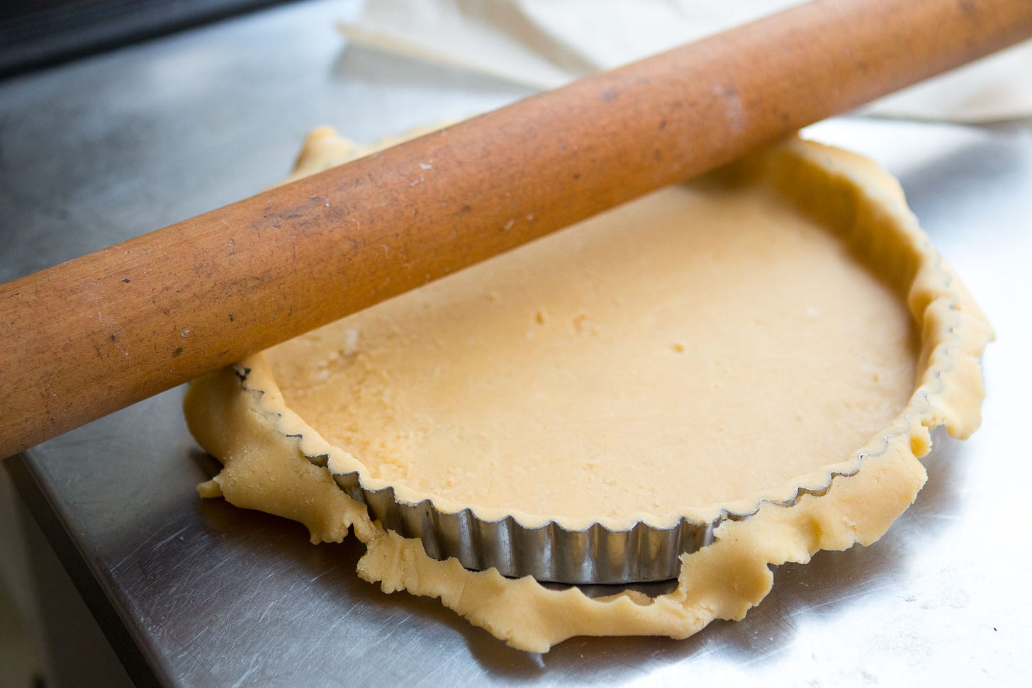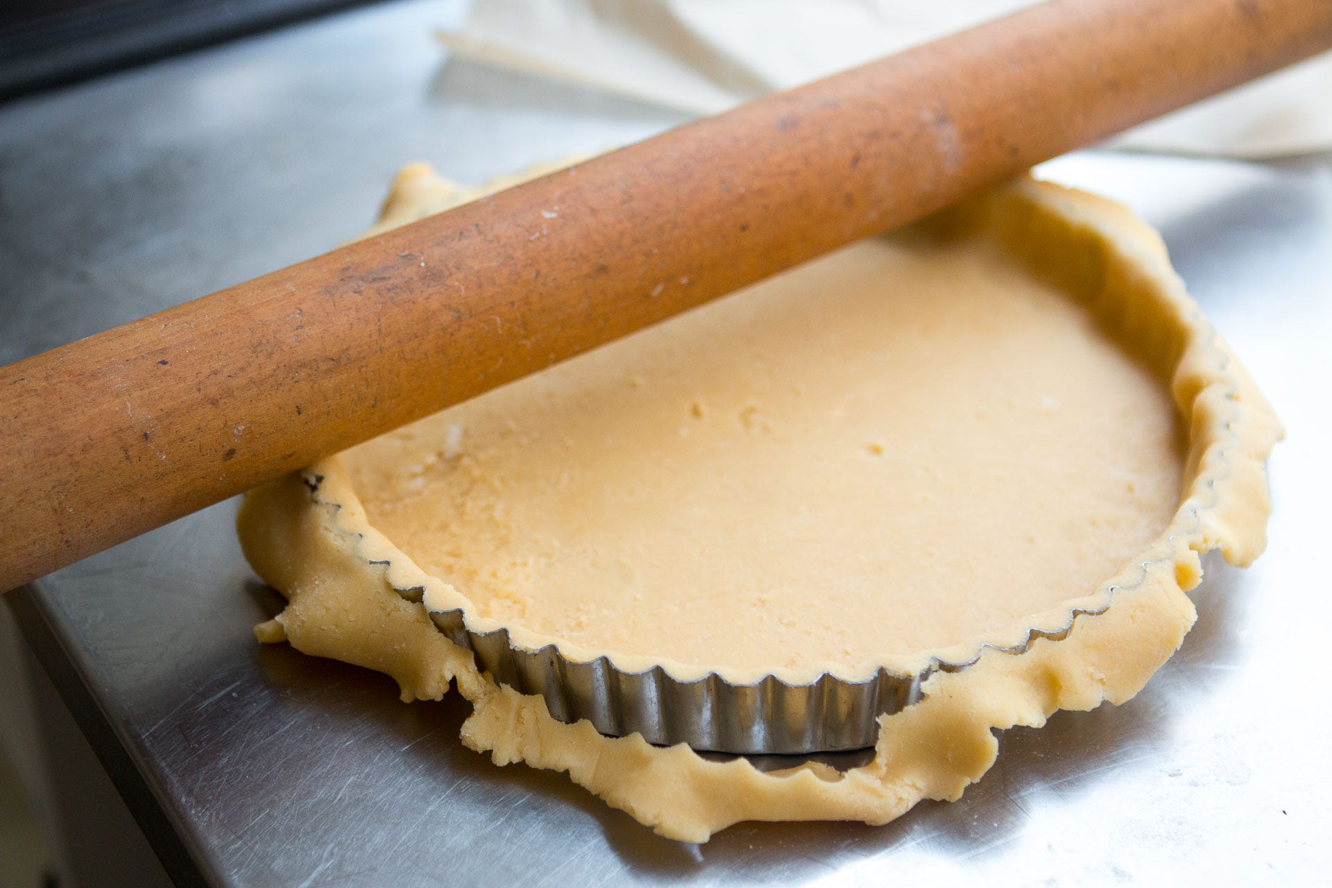5. Ease the dough into the pan by lifting the edges and letting it fall gently into the inside edges with a little help from your fingers. Avoid stretching it. Press the dough slightly against the sides of the pan to even it out and reinforce it, then roll the rolling pin over the top of the tart pan to lop off the overhanging dough.