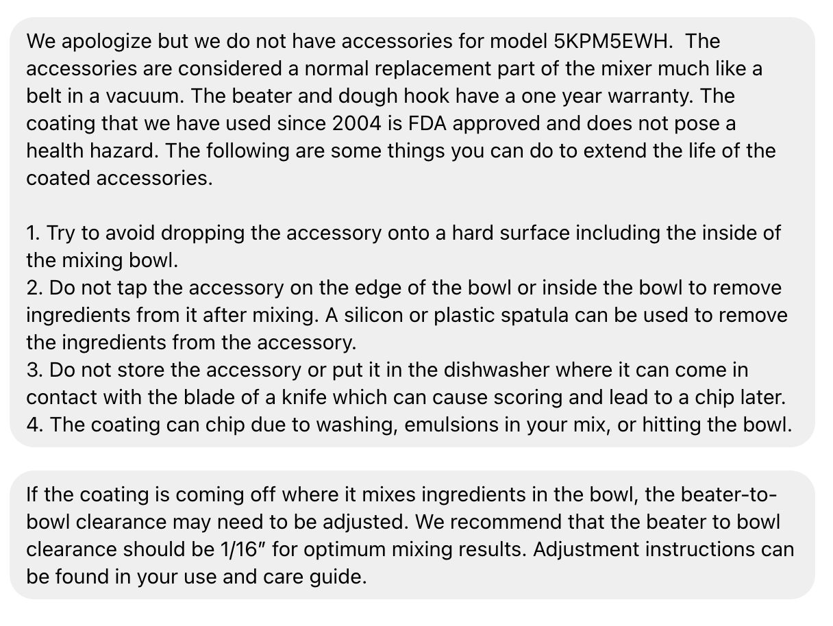 What surprised me even more is that they said the coating used since 2004 is “FDA approved and does not pose a health hazard.” That may be the case, but not sure I want pieces of it in my cake. The replacement paddles are selling on their website here in France for around €80 ($93) each.