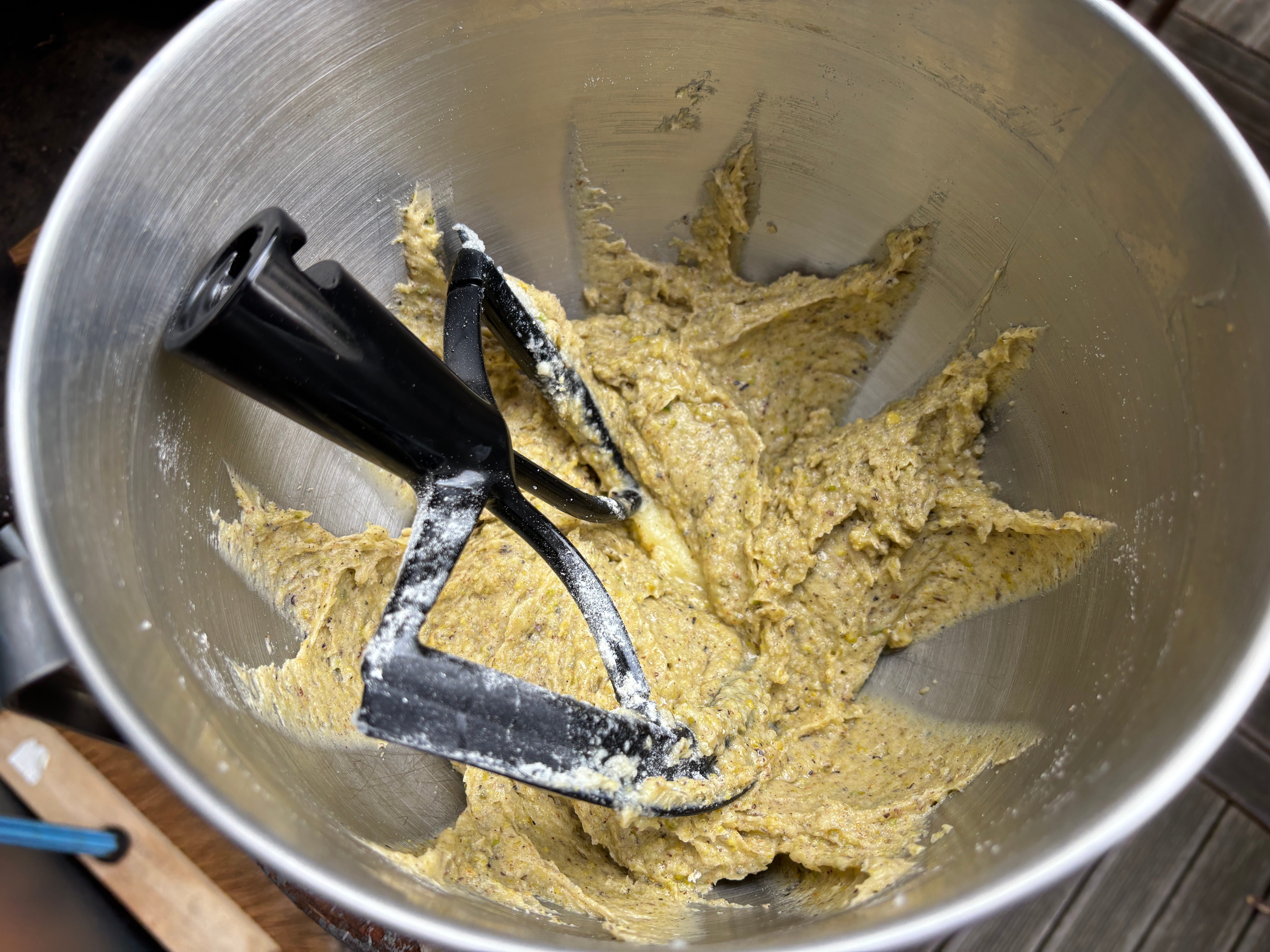 I made the Pistachio-cardamom cake from my book Ready for Dessert (shown at the top of the post), softening up the butter. Unlike the KA paddle, it shaped the butter and sugar into quenelles, which isn’t so ideal because the whole idea of beating the butter and sugar is to make them light and fluffy, so that’s a downside of the Beater Blade. But as I kept going, things got better.