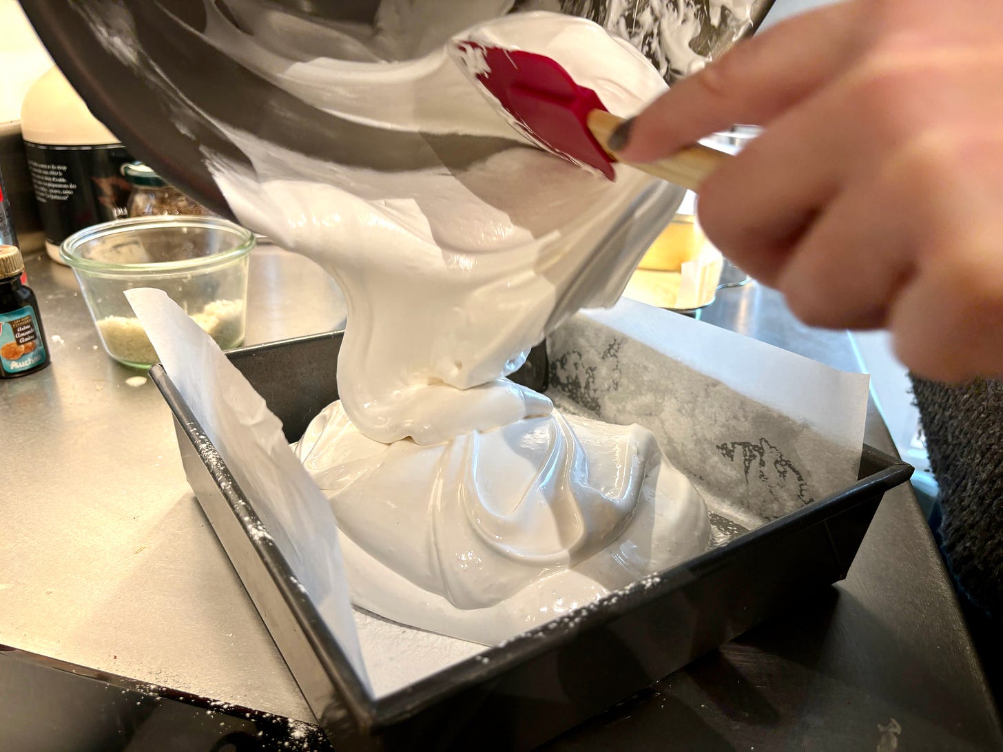 Scrape the marshmallow mixture into the prepared pan and use a spatula to even it out. Sift another layer of the powdered sugar mixture over the top and refrigerate, uncovered, for 20 to 30 minutes.