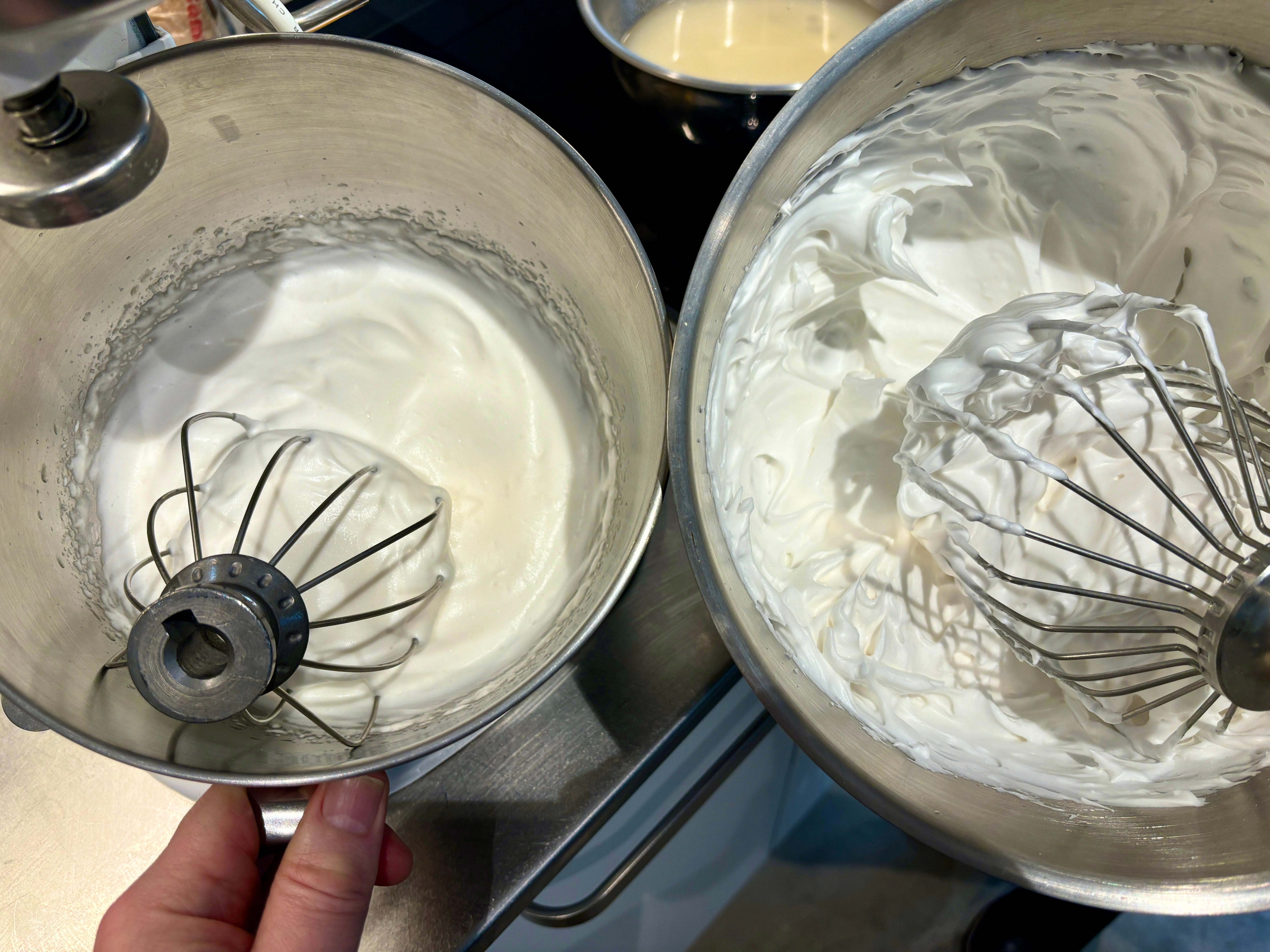 Once you’ve added all the syrup, increase the mixer speed to high and whip for 5 minutes until the meringue is stiff and shiny, and the outside of the mixing bowl no longer feels warm to the touch. Add the liquor or the vanilla and whip the meringue a little more to incorporate it.