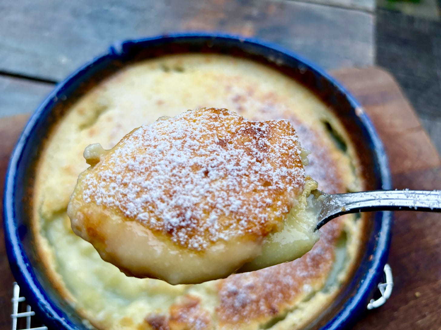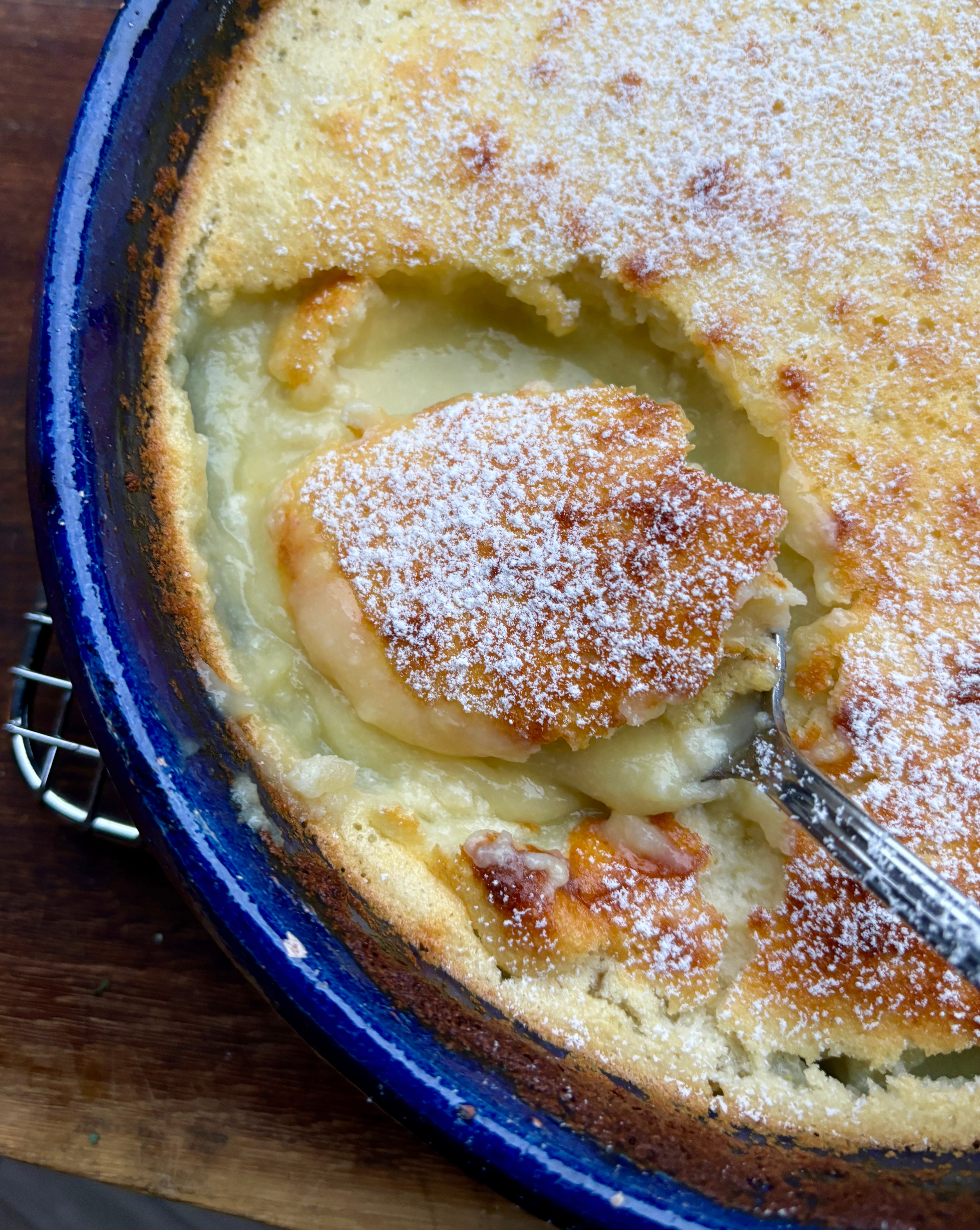 I had the Lemon Pudding recipe from Ballymaloe Desserts bookmarked for when I could harvest my own lemons (we have about a dozen on our tree, but ours aren’t ripe yet), so thanks to serendipity, warm Lemon Pudding was on the docket for dessert.